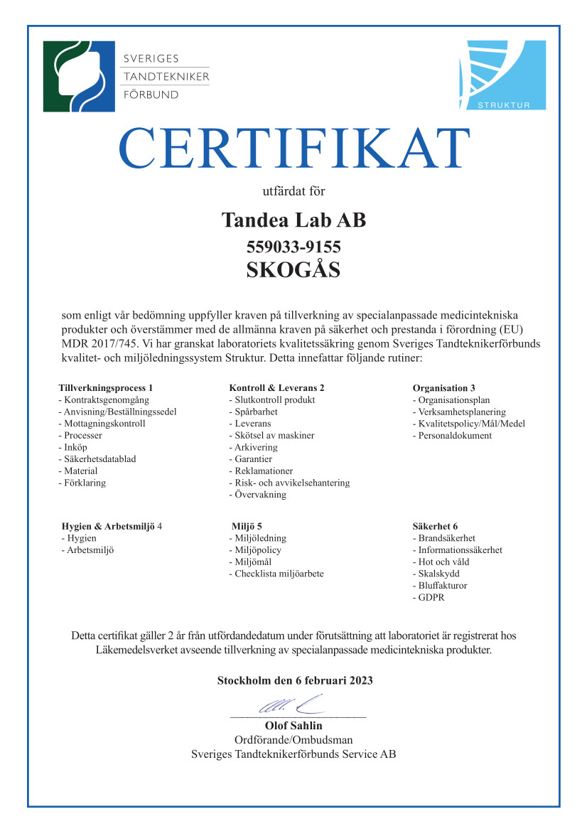 Förutom service av världsklass satsar vi också på högsta kvalitet, inte bara på våra produkter, men även på att vi har ordning och reda på våra rutiner och processer. Sedan år 2020 är vi certifierade via tandtekniker förbundets kvalitet- och ledningssystem STRUKTUR. Vi uppfyller därmed kraven på tillverkning av specialanpassade medicintekniska produkter och överensstämmer med alla myndighetskrav på säkerhet och prestanda.